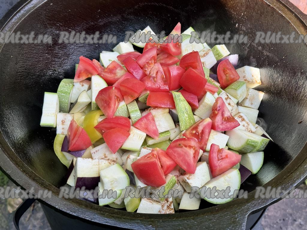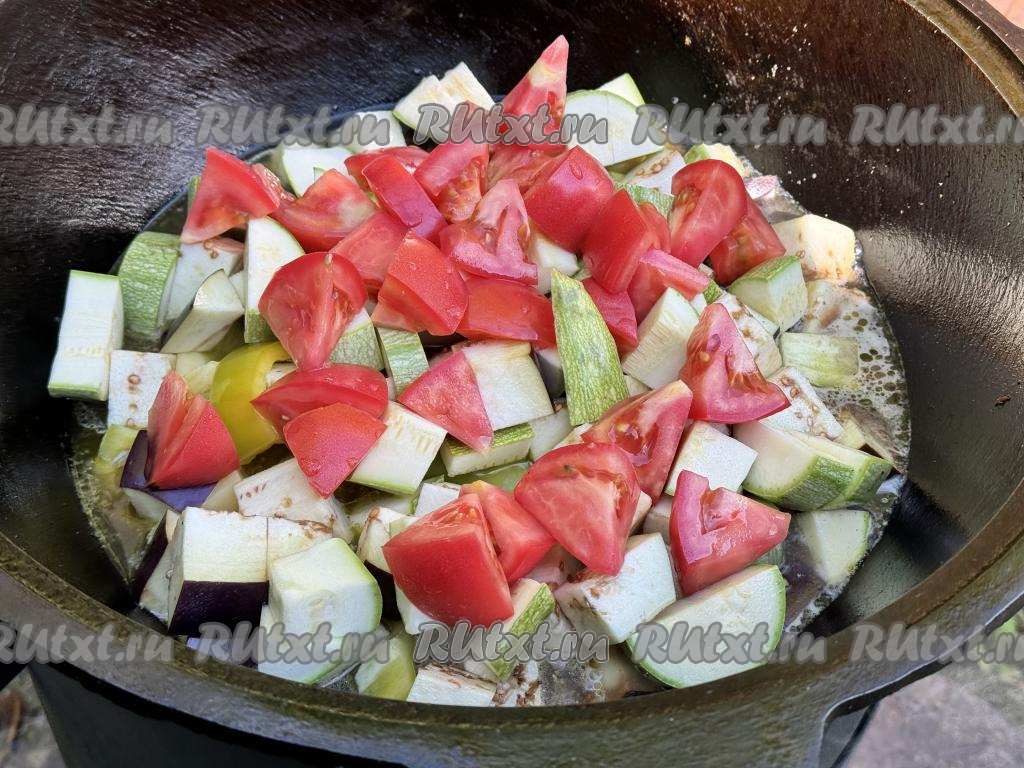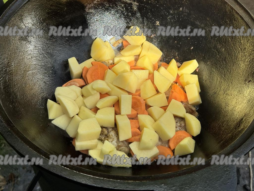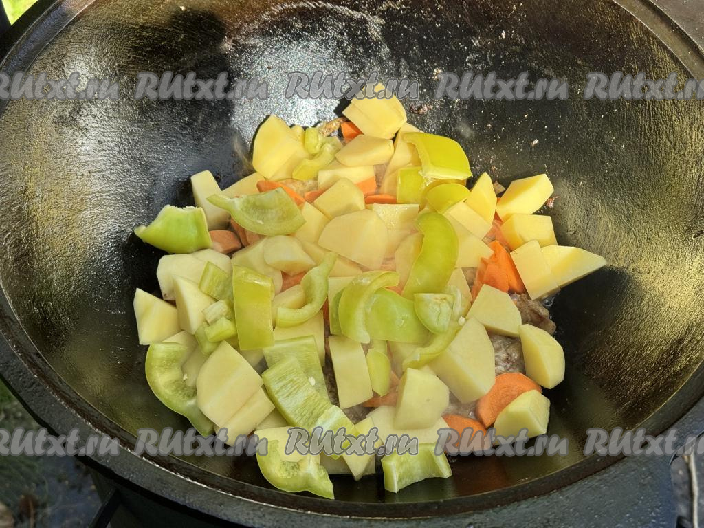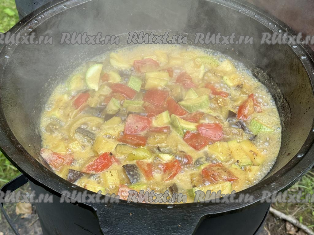 Влить в казан воду, накрыть крышкой. Курицу в казане с овощами на костре готовить примерно 30 минут с момента закипания воды.