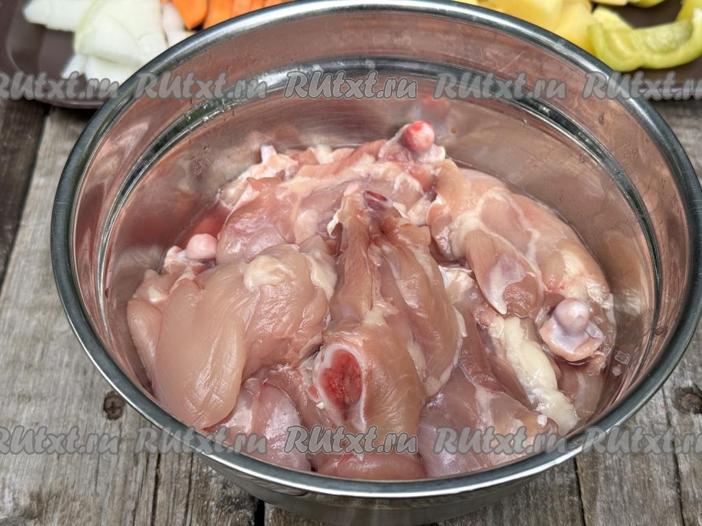 Для этого блюда можно взять любые части курицы. Можно взять целую небольшую курочку, нарезать её на порционные части. Я купила куриные бёдра, предварительно сняла с них кожу и разрезала каждое бёдрышко на 2 части. Части курицы помыть водой, обсушить.