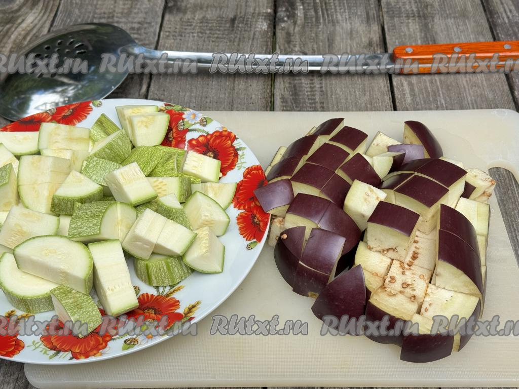 Для этого блюда я взяла небольшие молодые кабачки с тонкой кожурой и мелкими семечками, поэтому кожуру с них не снимала, просто обрезала кончики с двух сторон и вымыла. Если у вас будет крупный кабачок с толстой кожурой и крупными семечками, тогда кожуру обязательно срежьте, а семечки - удалите. Баклажаны вымыть, отрезать кончики с двух сторон. Баклажаны и 300 грамм подготовленного кабачка нарезать на средние кусочки.