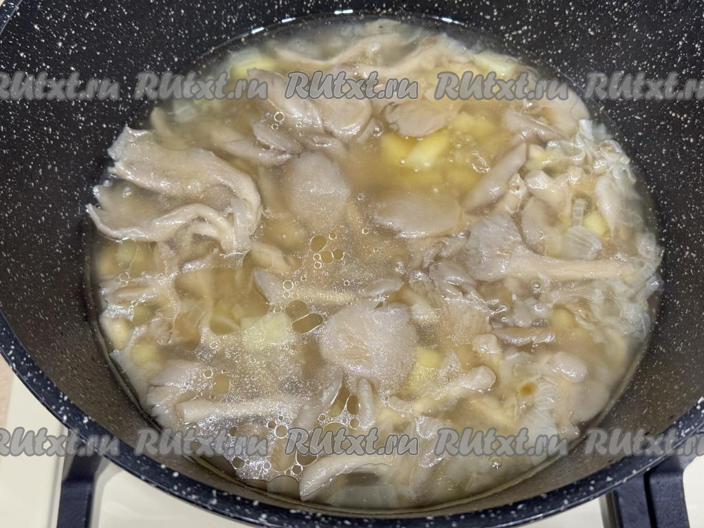 Дать воде закипеть, уменьшить огонь, варить грибной суп из вешенок 20 минут.