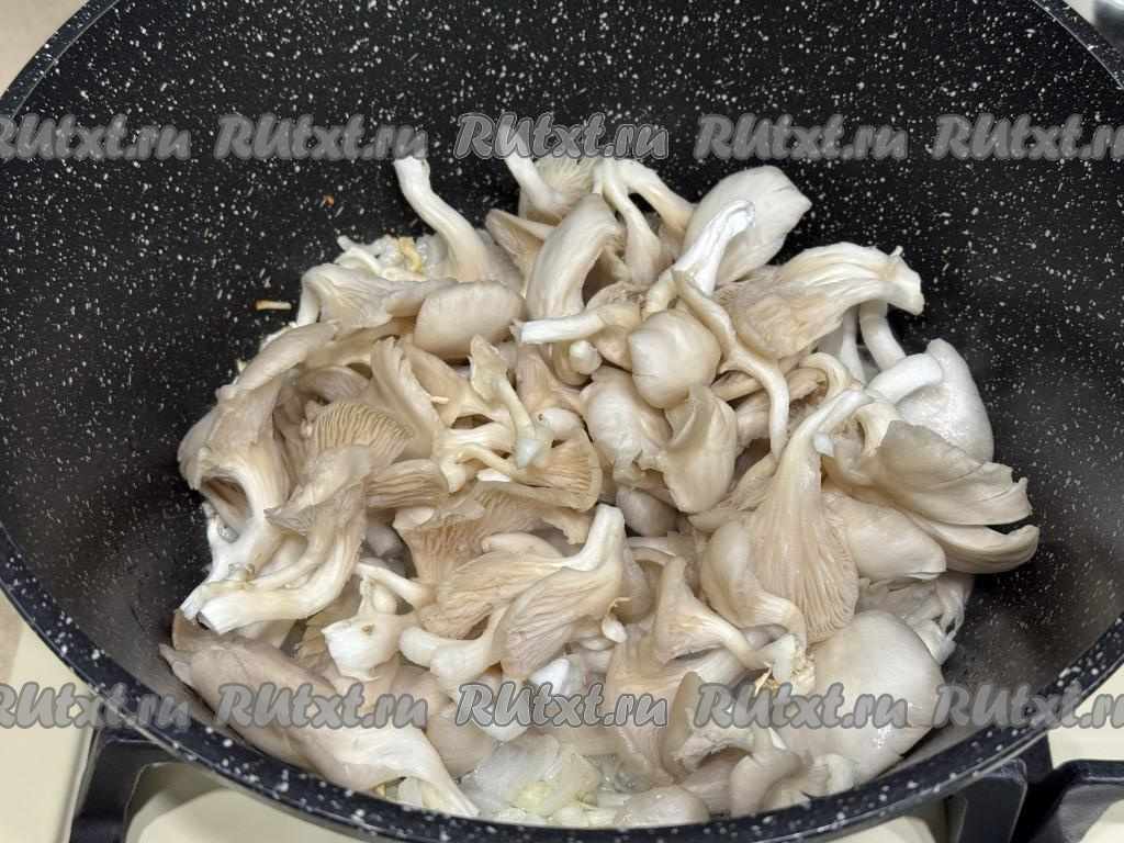 К обжаренному луку добавить вешенки, перемешать. Обжарить грибы с луком в течение 10 минут, время от времени помешивая.