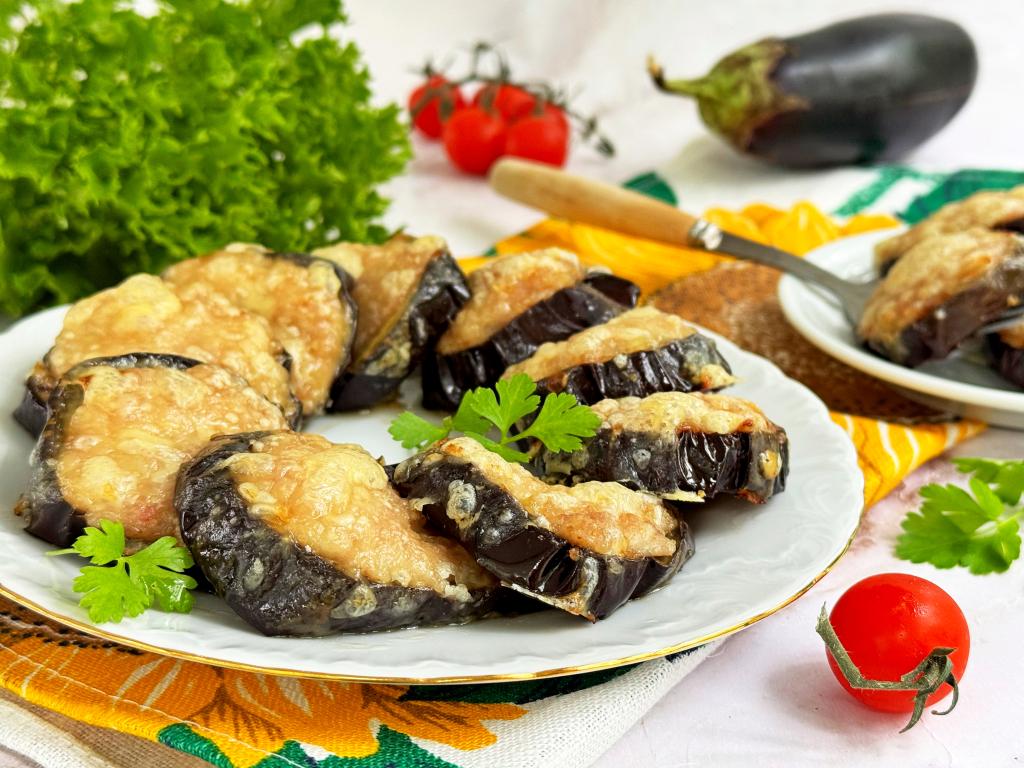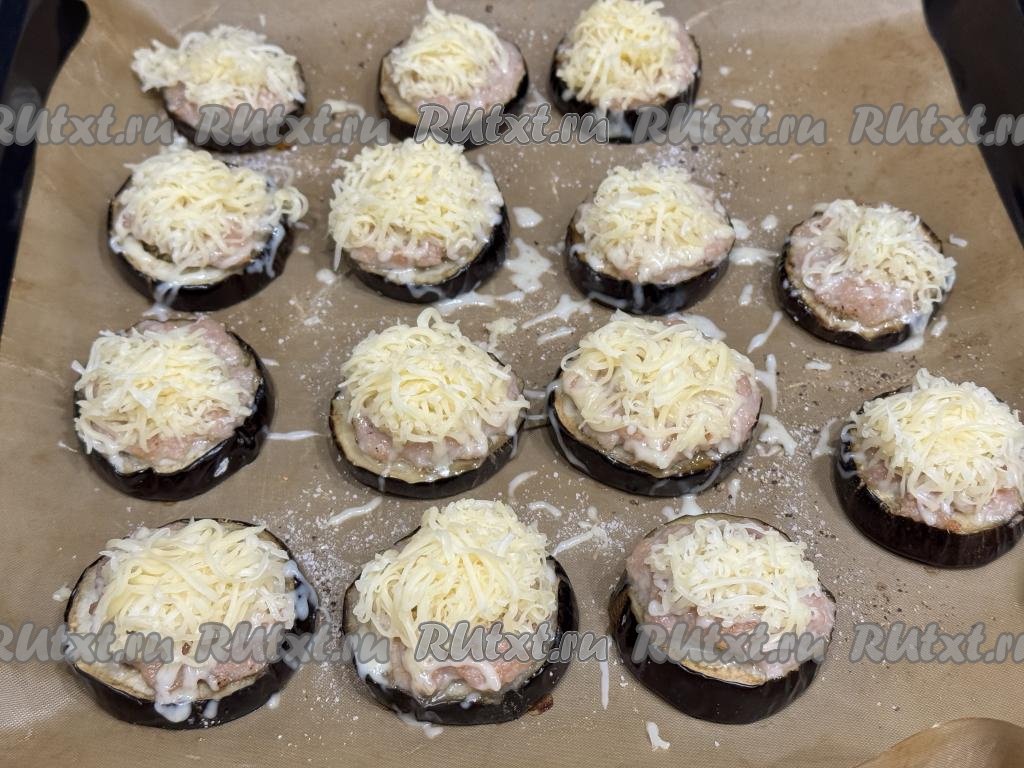 Затем достать противень из духовки, присыпать баклажаны с фаршем сыром, натёртым на мелкой тёрке.