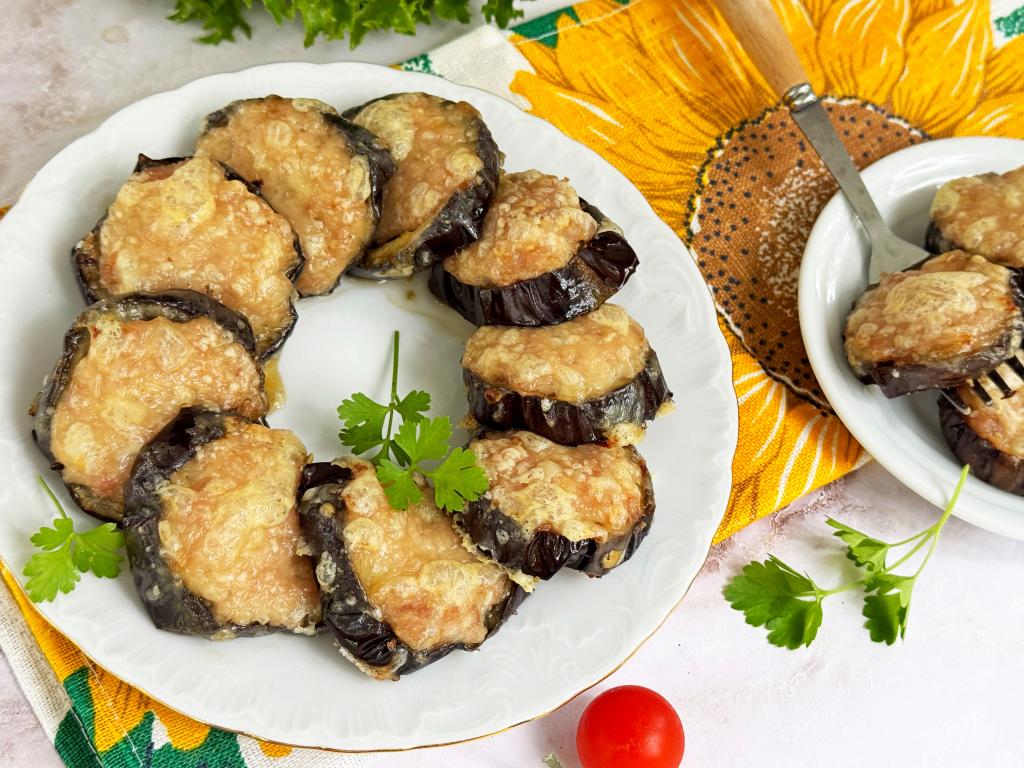 Горячие кружочки баклажана с фаршем, покрытые аппетитной корочкой из сыра, вынуть из духовки, переложить на тарелку и в горячем виде подать к столу. Блюдо получается и сытным, и вкусным, и аппетитным, а готовится просто и достаточно быстро.