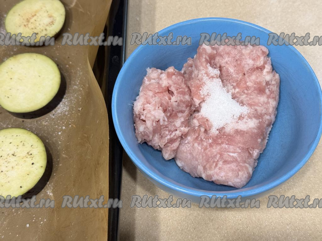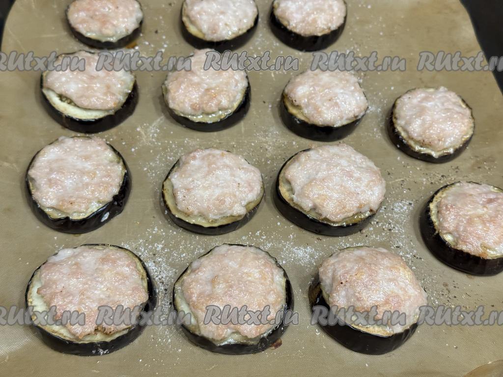 Противень застелить ковриком (или пергаментом) для выпечки, выложить кружочки баклажана. Каждый кружочек слегка присолить и присыпать чёрным молотым перцем. Всего у меня получились 14 кружочков.