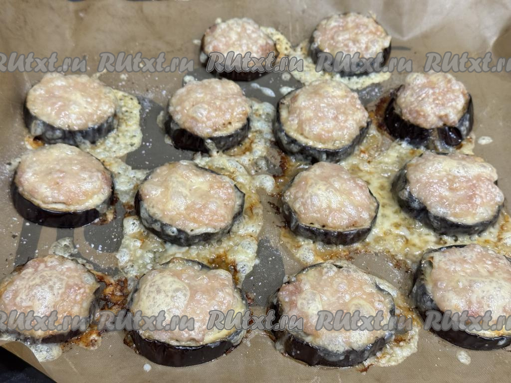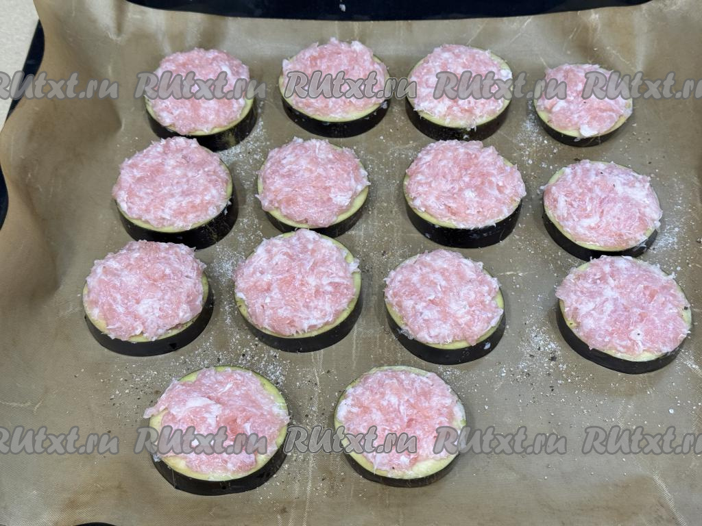 Кружочки баклажанов с фаршем запекать в разогретой до 200 градусов духовке в течение 15 минут.