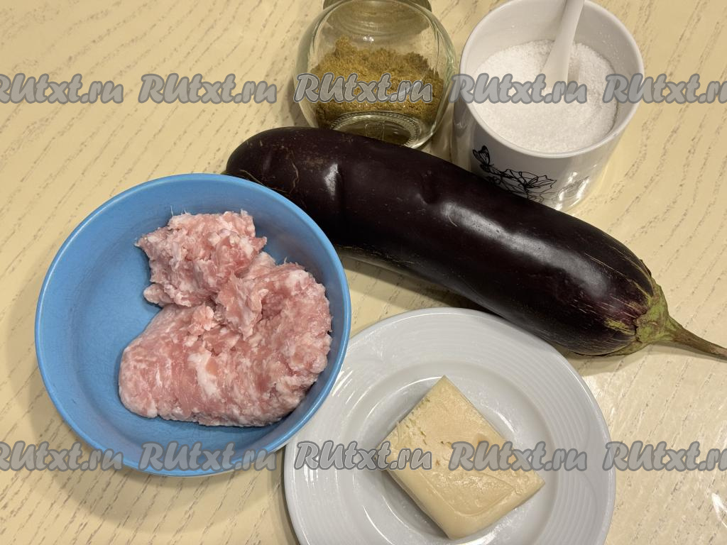 Подготовить продукты. Баклажан вымыть. Фарш можно использовать любой, у меня - из свинины. Сыр можно взять как твёрдый, так и полутвёрдый.