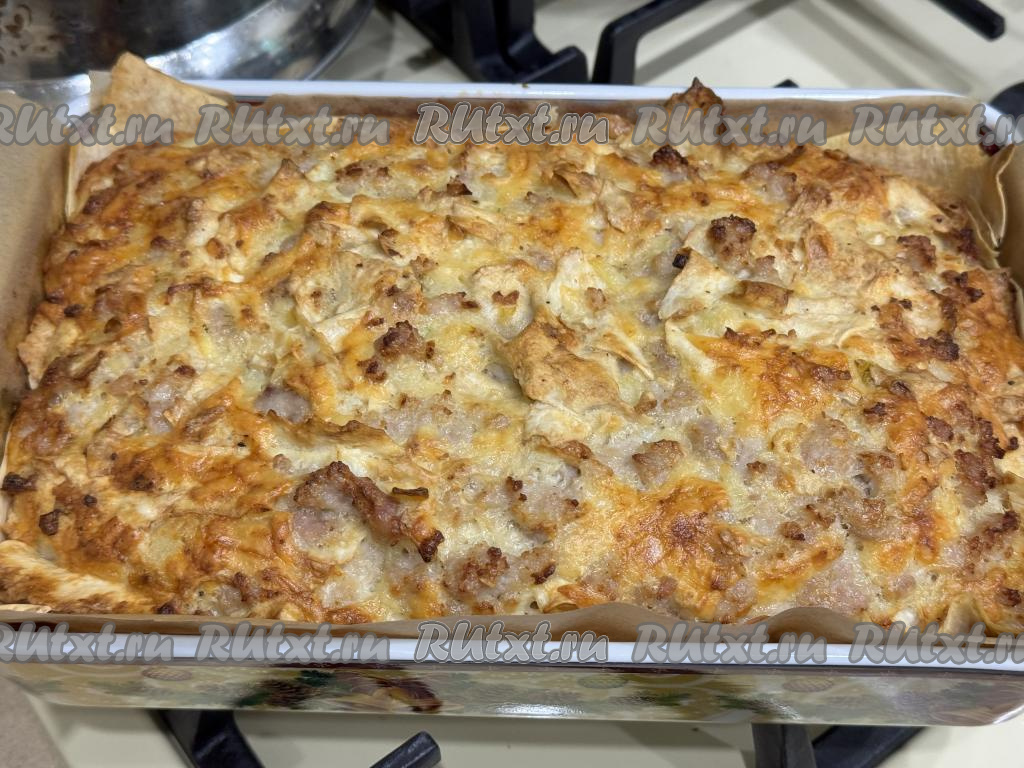 Пирог из рваного лаваша с фаршем поставить в разогретую до 200 градусов духовку, запекать 40 минут.