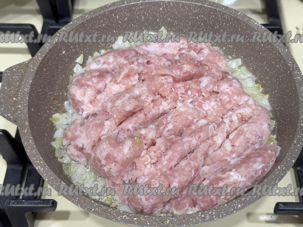 К луку, обжаренному до прозрачности, выложить мясной фарш.