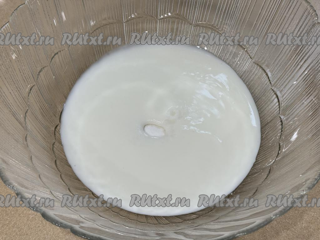 Пока остывает фарш, влить кефир в глубокую миску, всыпать соду, перемешать столовой ложкой и оставить на 5 минут. Кефир вступит в реакцию с содой, покроется пузырьками и увеличится в объёме.