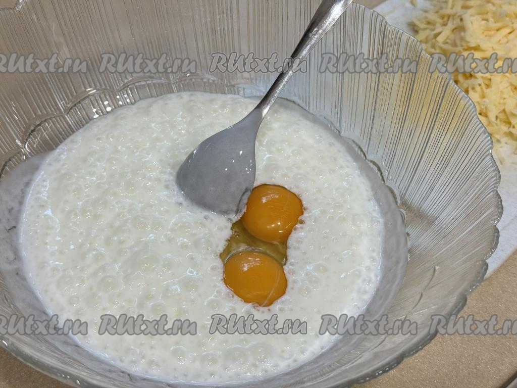 По прошествии 5 минут в миску со смесью кефира и соды добавить сырые яйца, перемешать.