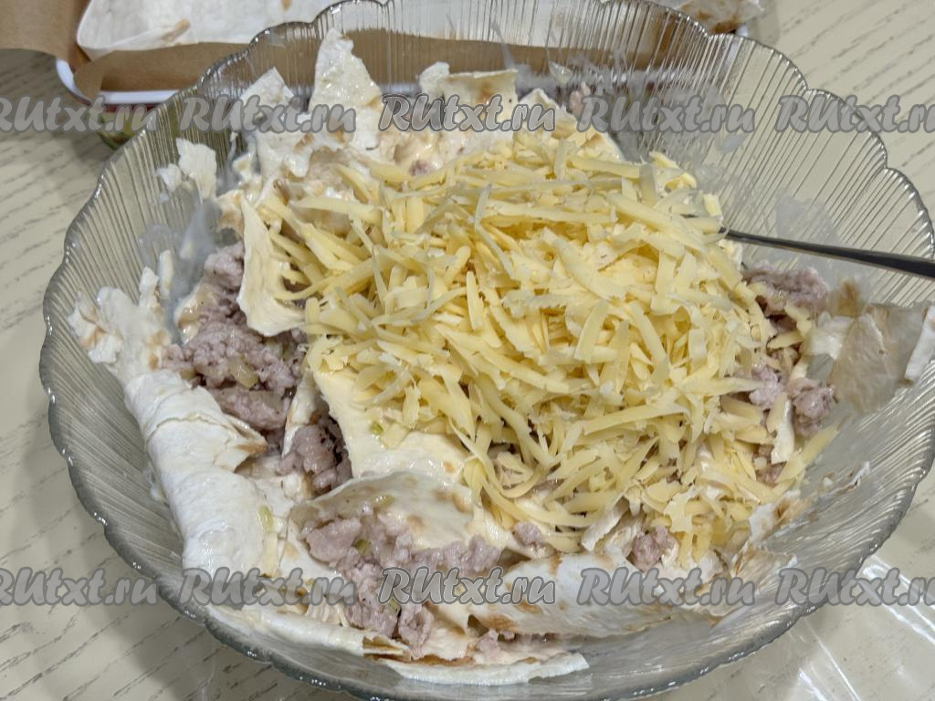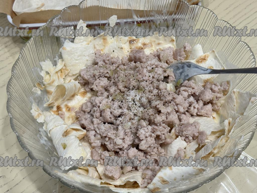 Перемешать лаваш с фаршем и сыром.