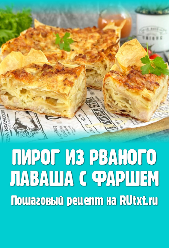 Нарезать пирог из рваного лаваша с фаршем на порционные кусочки и тёплым подать к столу.