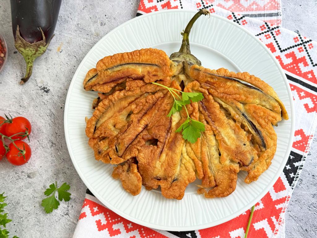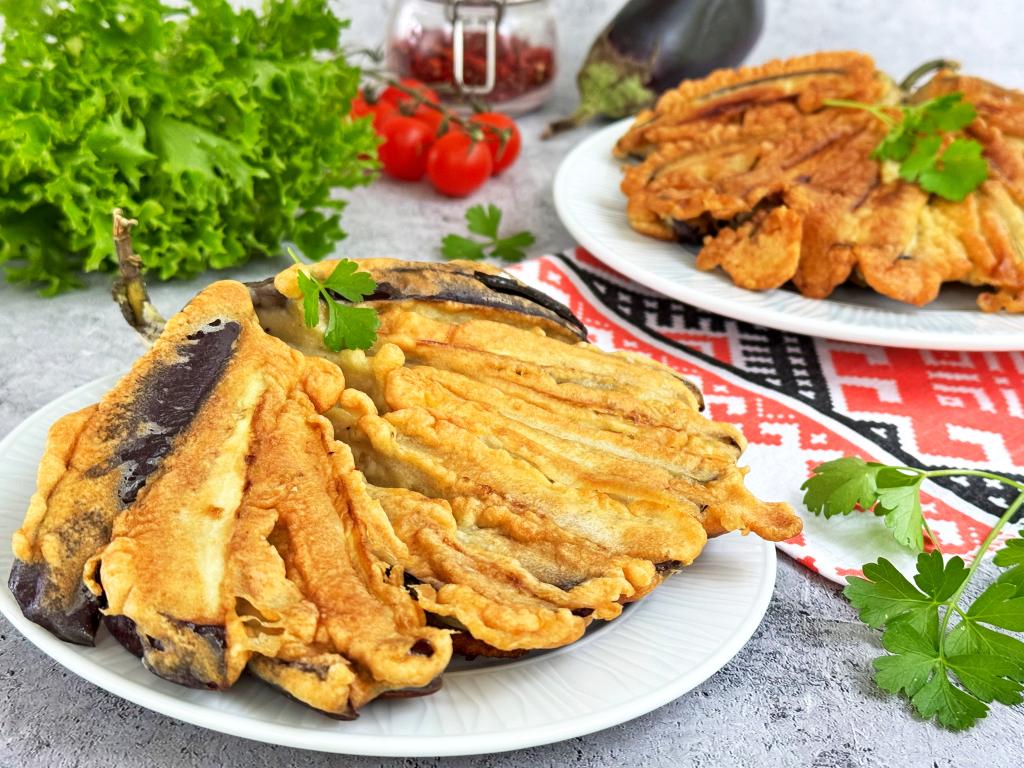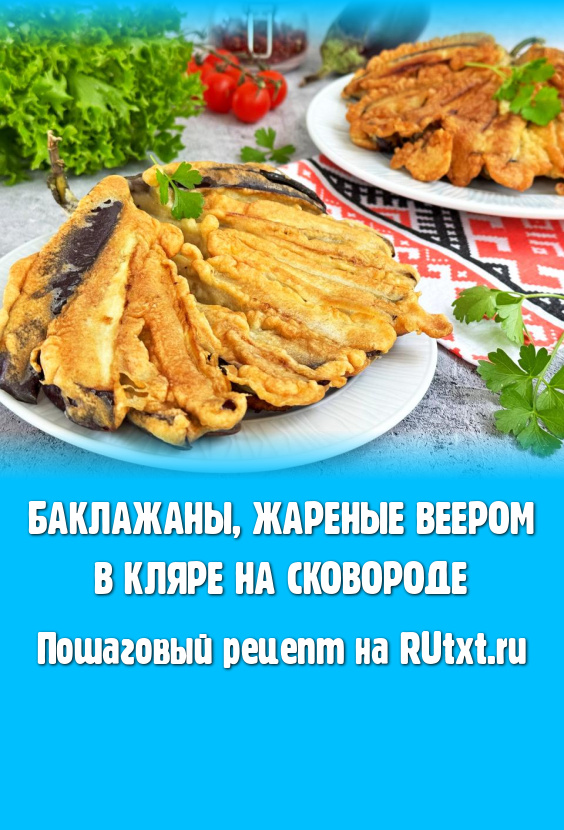 В последнее время появляется немало рецептов приготовления баклажанов, нарезанных веером. Чаще всего такие баклажаны запекают в духовке. А в этот раз я предлагаю пожарить на сковороде вееры из баклажанов, покрытые кляром. Блюдо получается очень вкусным, сытным, аппетитным. К столу жареный веер из баклажанов можно подать в качестве гарнира (например, к котлетам, сосискам) или в качестве самостоятельного блюда, дополнив любимым соусом.
