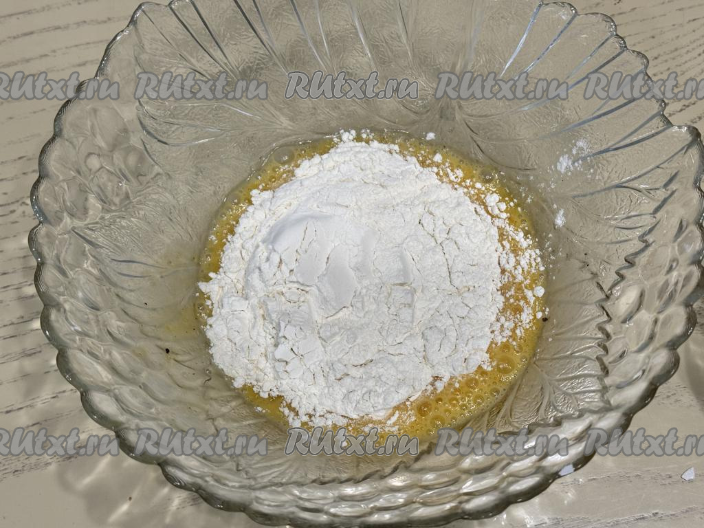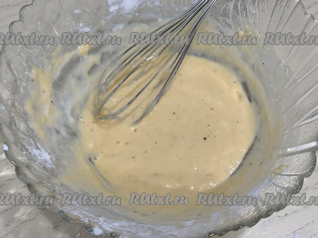 Всыпать муку в миску, перемешать кляр венчиком до однородности.