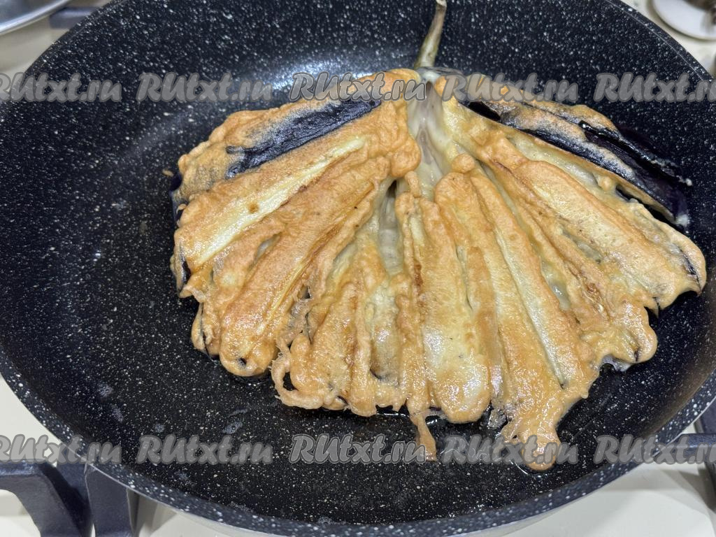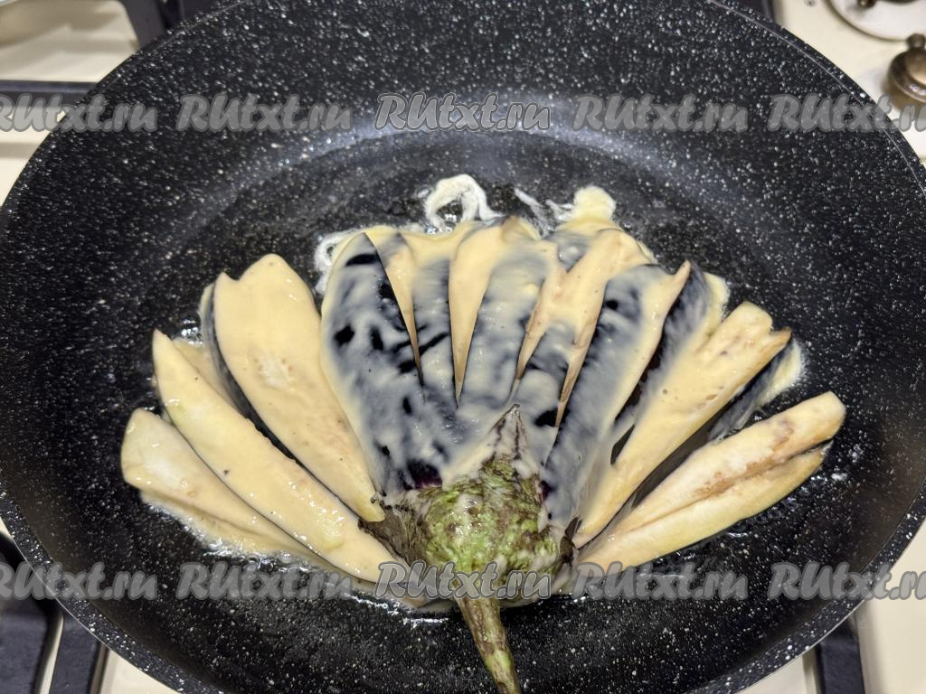 В сковороду влить растительное масло, разогреть, затем выложить веер из баклажана, покрытый кляром.