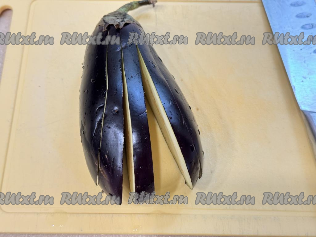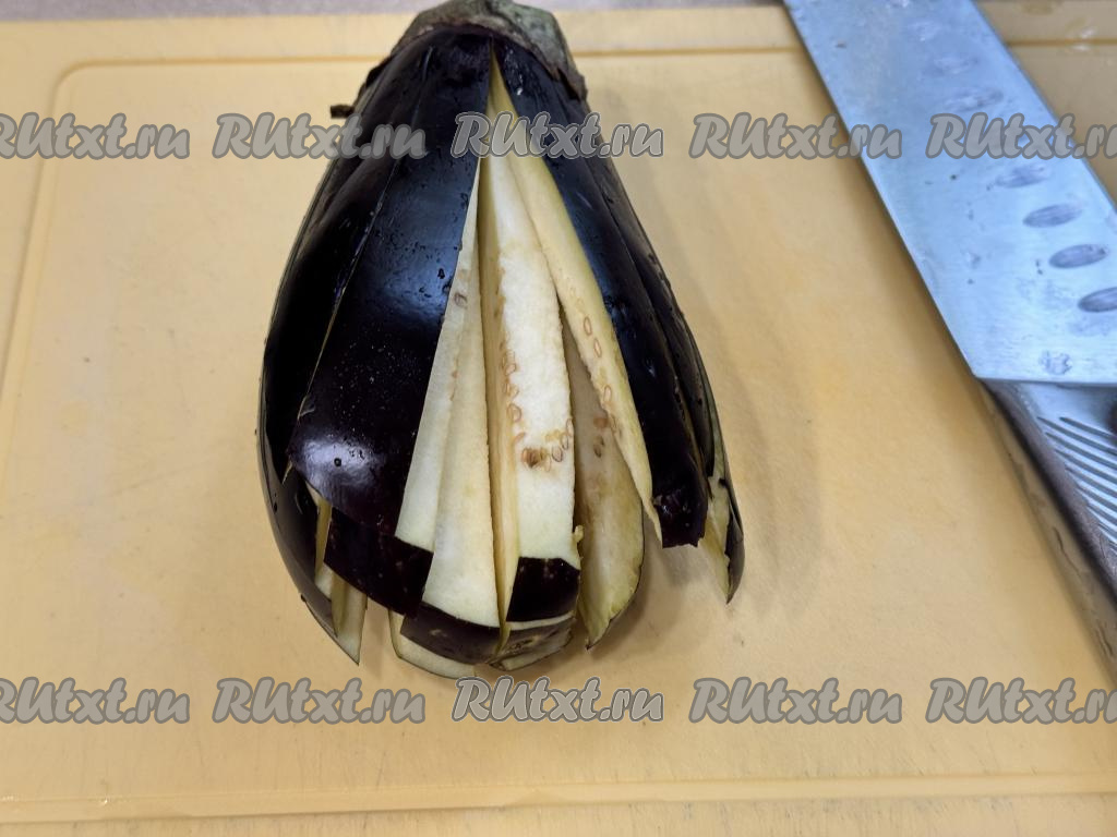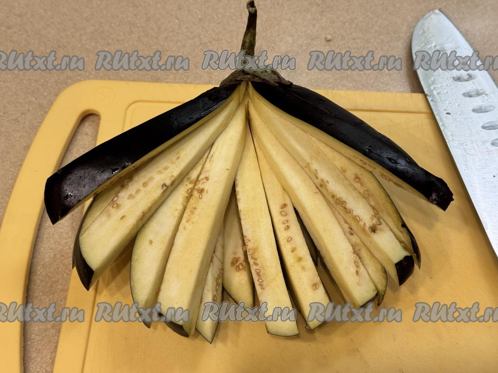 Баклажан нарезать на полоски толщиной примерно 0,5 сантиметра, не дорезая до хвостика баклажана.