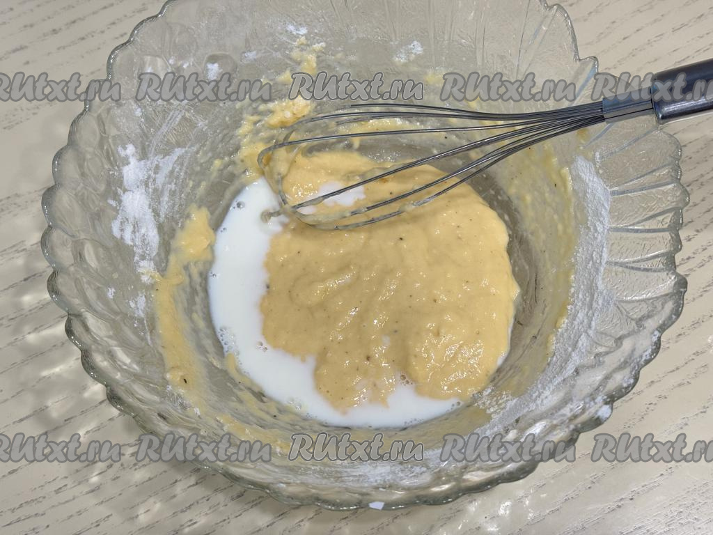 В кляр влить 1 столовую ложку молока, перемешать венчиком.