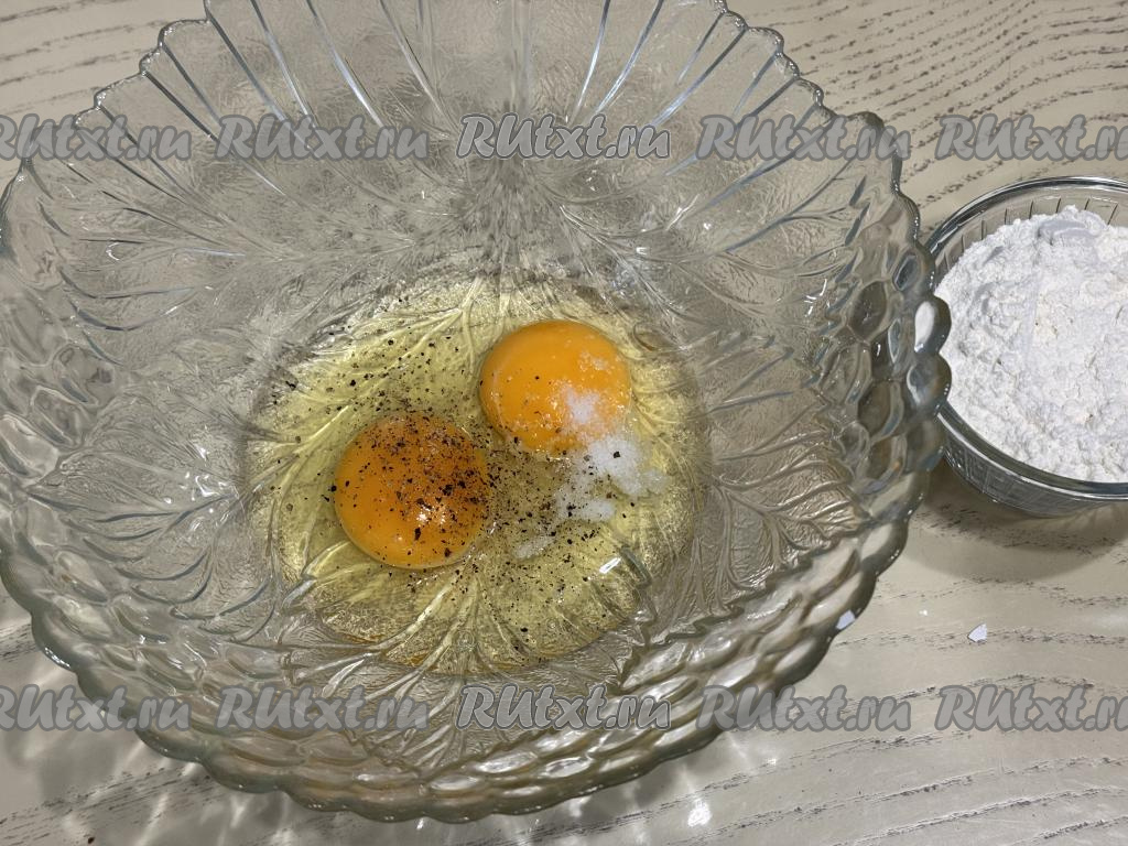 Для получения кляра нужно взять объёмную миску, она должна быть такого размера, чтобы в дальнейшем в неё полностью в длину поместился весь веер из баклажана. В миску вбить яйца, добавить соль и чёрный молотый перец, перемешать венчиком до однородности.