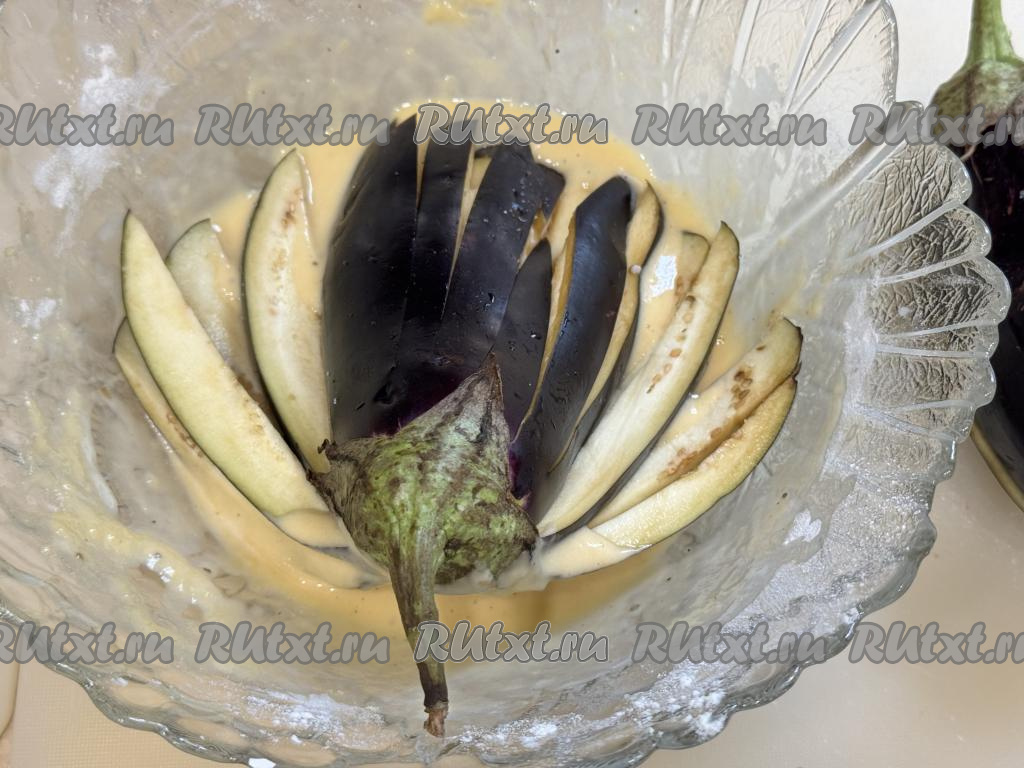 Обмакнуть вначале один баклажан в получившийся кляр с двух сторон. Все брусочки баклажана должны быть покрыты кляром.