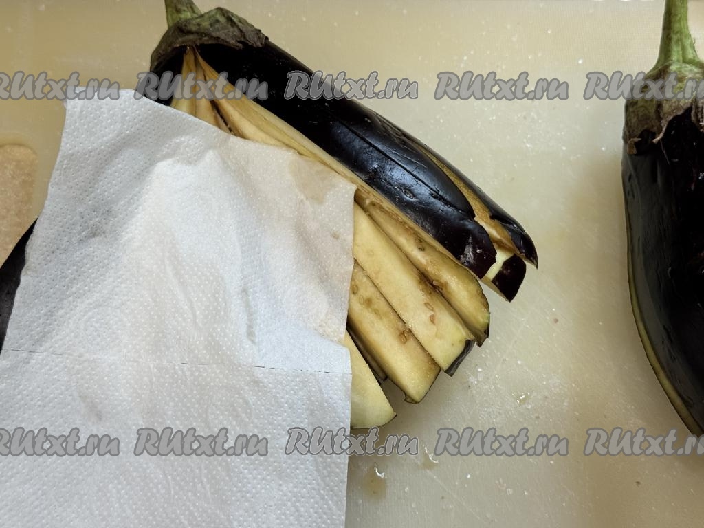 По прошествии 10-15 минут посоленные баклажаны выделят сок. Промокнуть мякоть каждого баклажана бумажным полотенцем, убирая выделившийся сок.