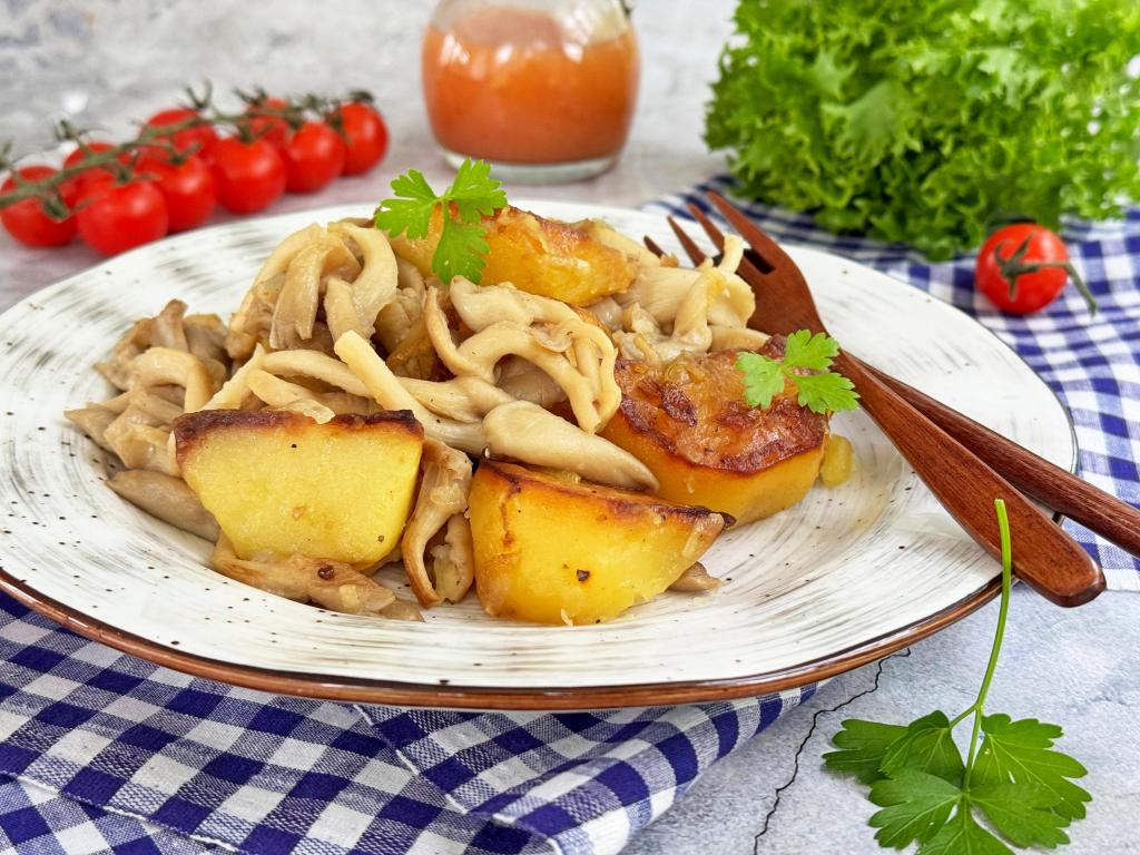 Предлагаю разнообразить меню и пожарить на сковороде вешенки с картошкой и луком. Несмотря на простоту приготовления и доступность ингредиентов, это постное блюдо получается очень вкусным, сытным, аппетитным. Есть такую картошечку с грибами одно удовольствие. При подаче жареную картошку с вешенками можно дополнить овощным салатом или домашними соленьями.
