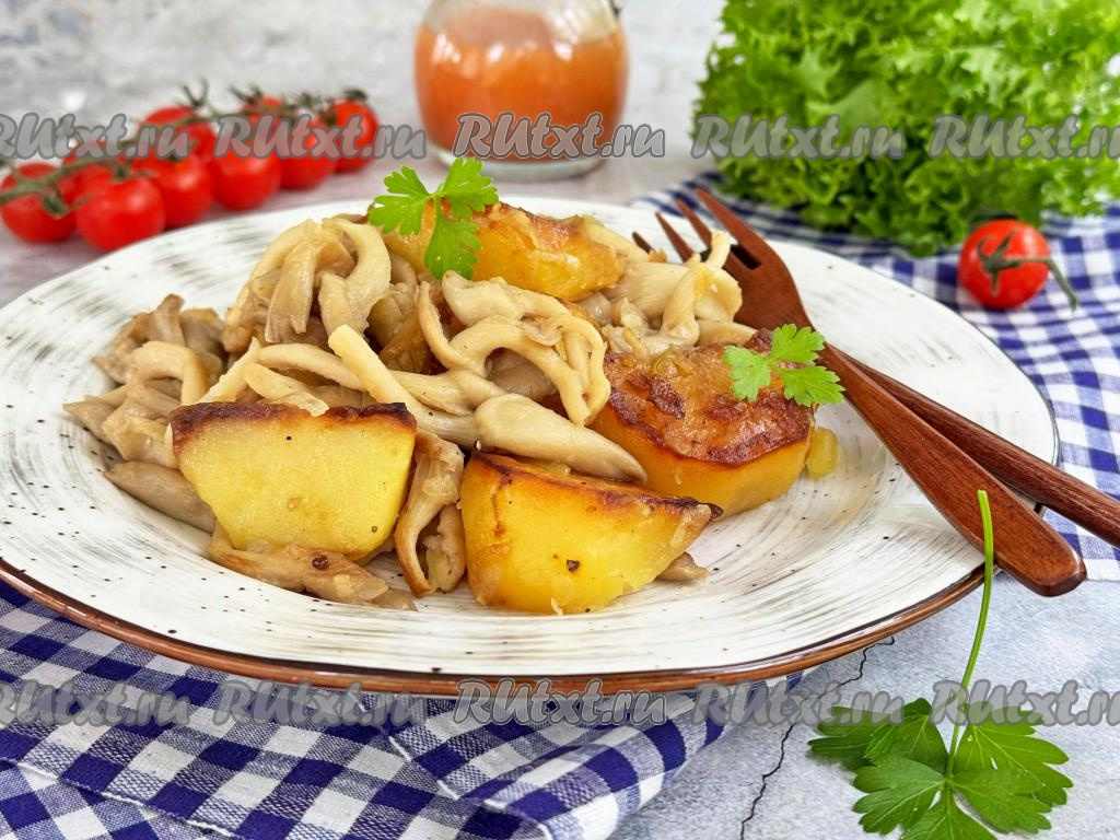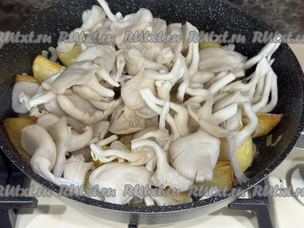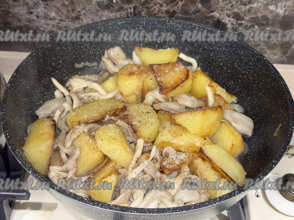 Жарить вешенки с картошкой и луком на среднем огне примерно 15-20 минут (до готовности картофеля, готовые картошины будут легко прокалываться ножом). 2-3 раза в процессе жарки нужно блюдо перемешать. В конце жарки посолить и поперчить картошку с грибами по вкусу, перемешать, потомить несколько минут.