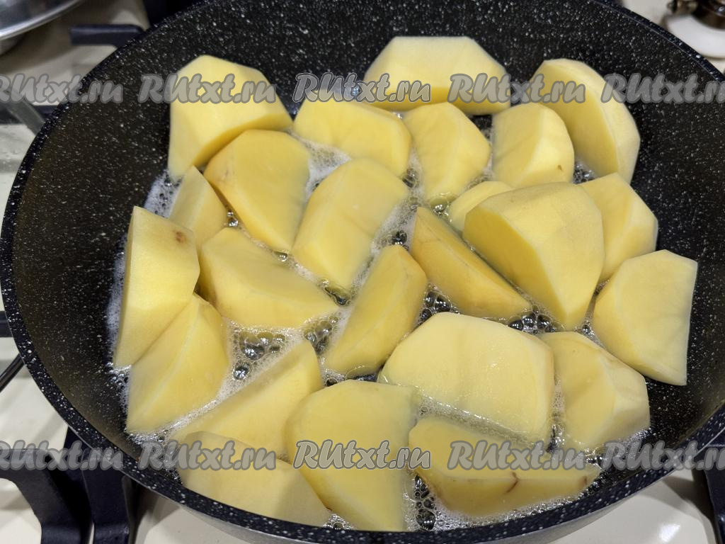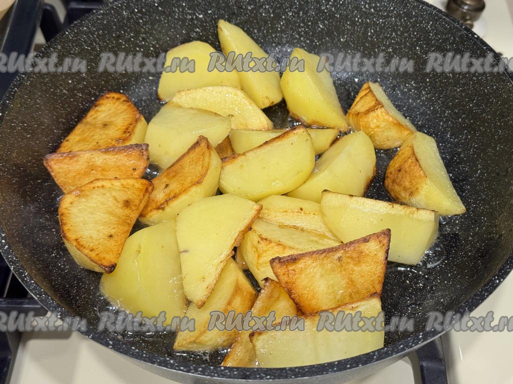Жарить картошку на достаточно сильном огне до золотистого цвета со всех сторон. Не нужно часто перемешивать, пусть края картошки покроются золотистой корочкой.