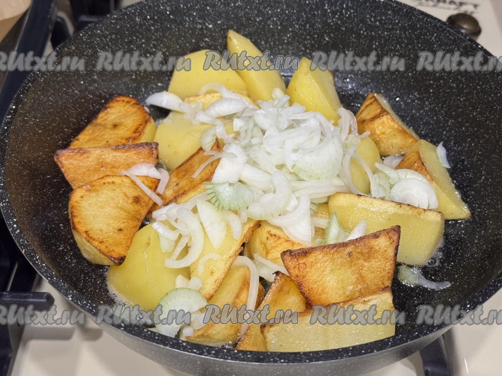 Как только картошка покроется золотистой корочкой, добавить в сковороду лук, нарезанный на полукружочки, перемешать. Сделать огонь средним и обжарить картошку с луком в течение 5 минут.