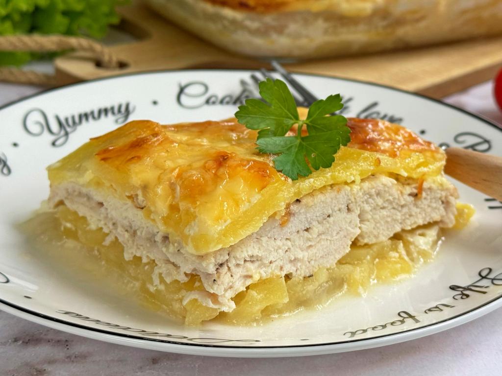 Выложить поверх куриного мяса оставшиеся кружочки картошки в один слой внахлёст.