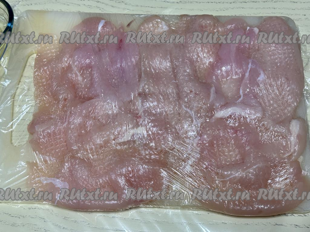 Выложить кусочки мяса на разделочную доску в один слой, накрыть филе пищевой плёнкой и слегка отбить кулинарным молоточком.