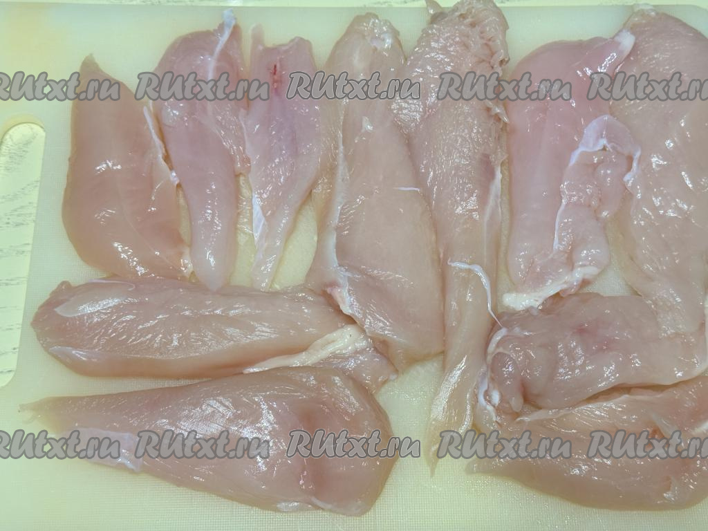 Куриное филе нарезать на плоские кусочки толщиной примерно 5 миллиметров.
