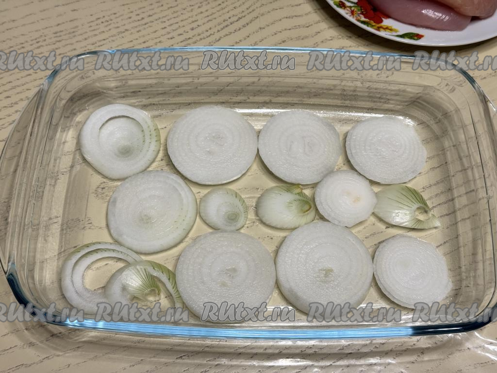 На дно жаропрочной формы (я взяла форму размером 28 сантиметров на 17 сантиметров) выложить в один слой лук, нарезанный на кольца.