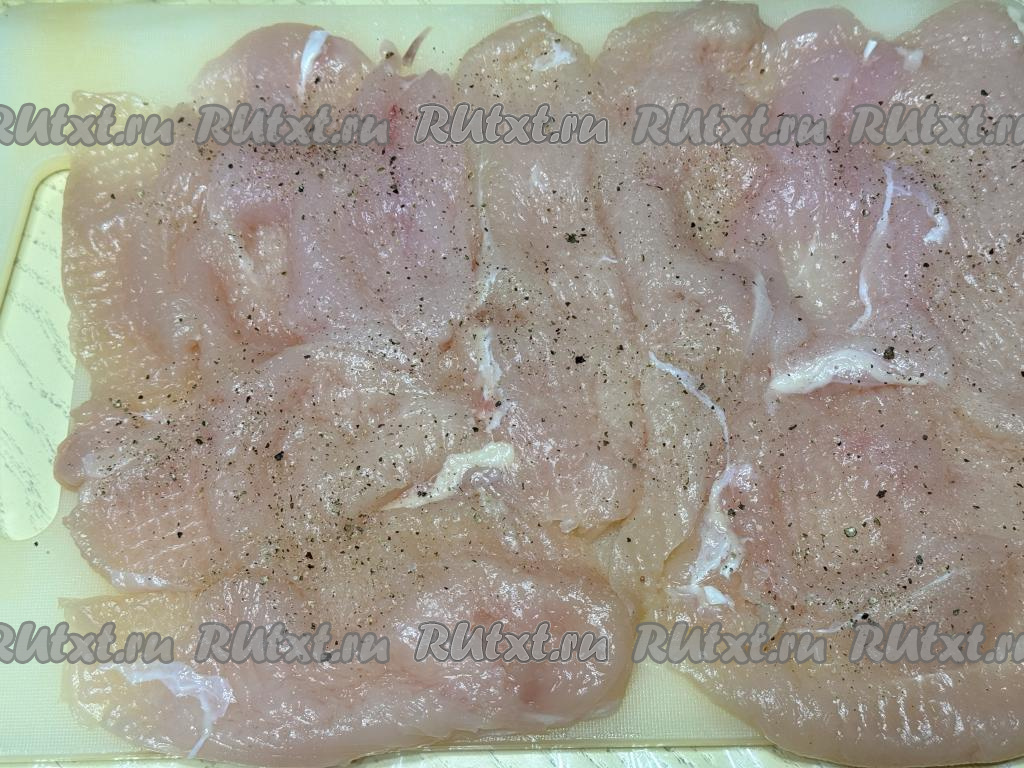 Посолить, поперчить отбитые кусочки куриного мяса.