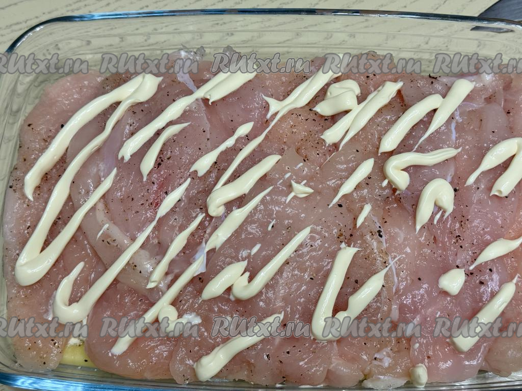 Выложить отбитые кусочки мяса курицы поверх картошки, нанести сетку из майонеза.