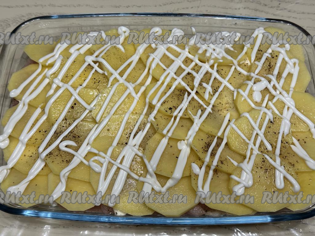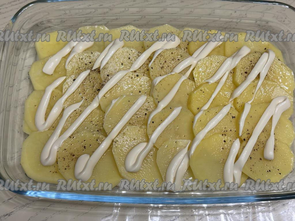 Посолить и поперчить слой картошки, нанести решётку из майонеза.