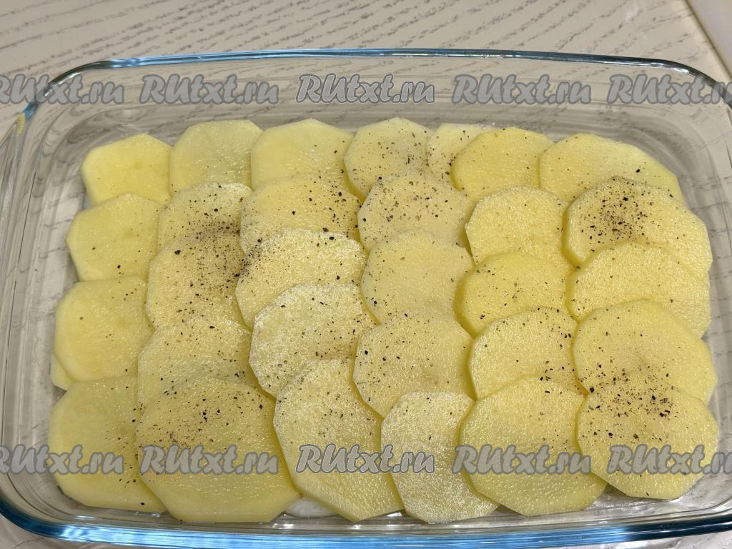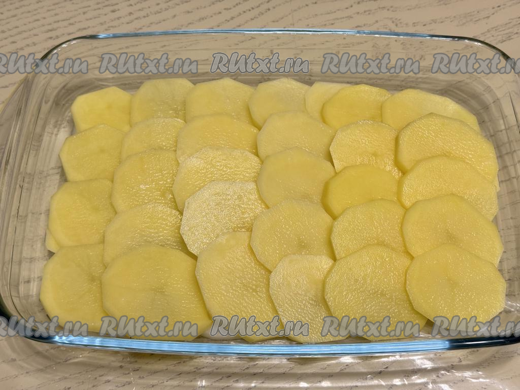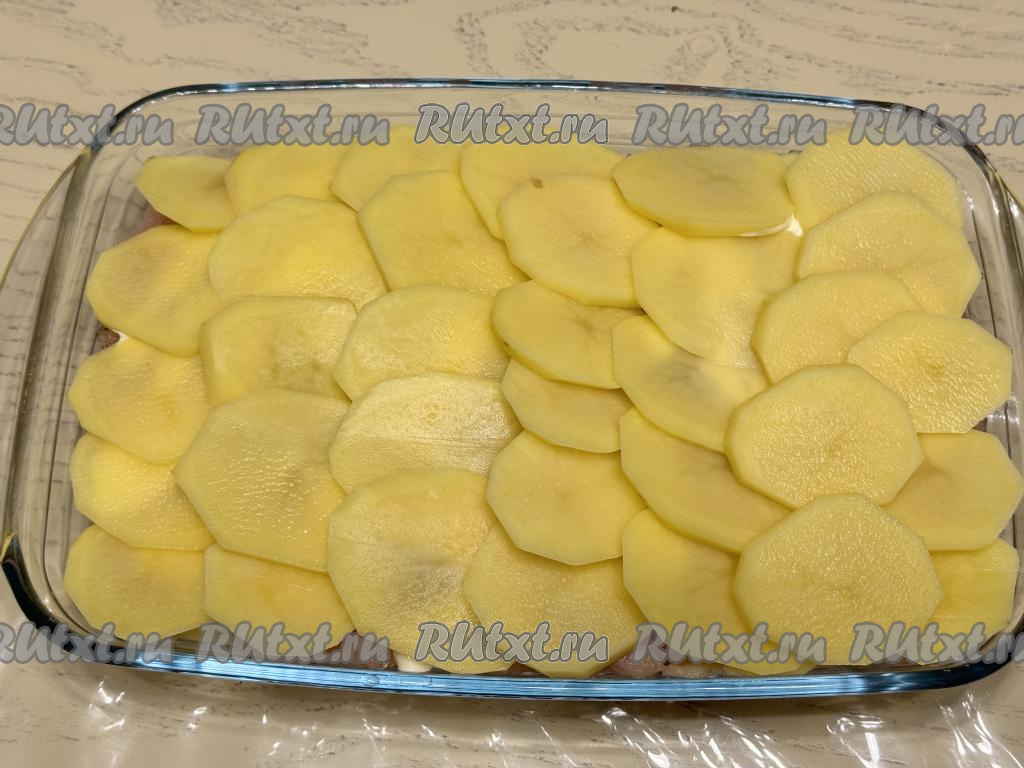 Картошку нарезать на тонкие кружочки (я нарезала на кружочки толщиной 5 миллиметров). В жаропрочную форму поверх лука выложить в один слой внахлёст половину нарезанного картофеля.