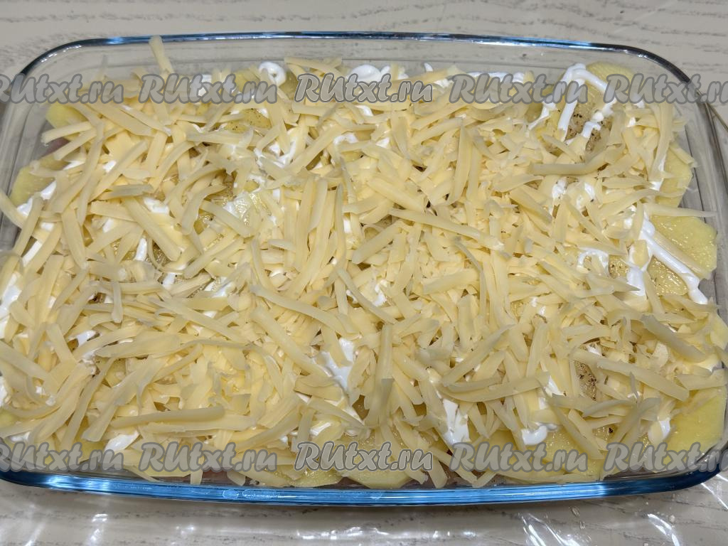 Сыр натереть на крупной тёрке и равномерно распределить поверх картошки.
