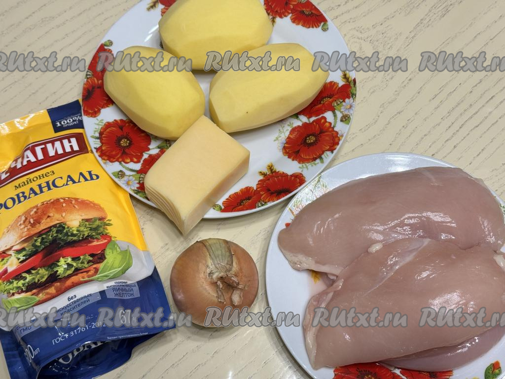 Подготовить продукты. Картошку и лук почистить. Куриное филе промыть водой, обсушить.
