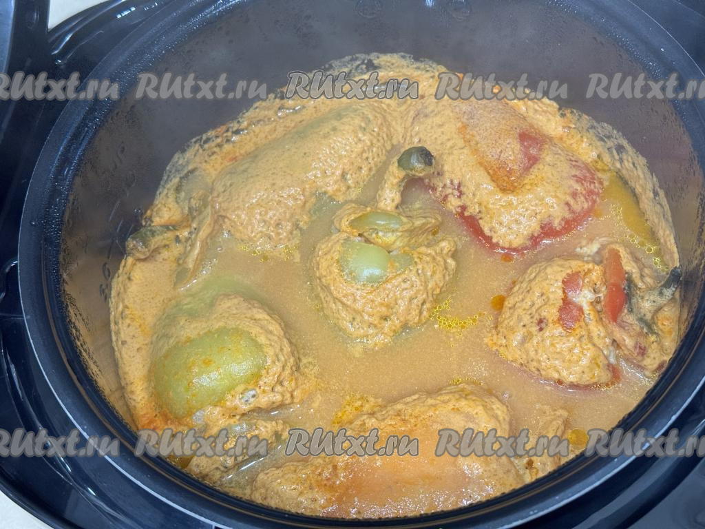 Установить чашу с фаршированными перцами в томатно-сметанном соусе в мультиварку, закрыть крышку, выставить режим "Тушение" на 1 час. После звукового сигнала мультиварки блюдо будет полностью готово.
