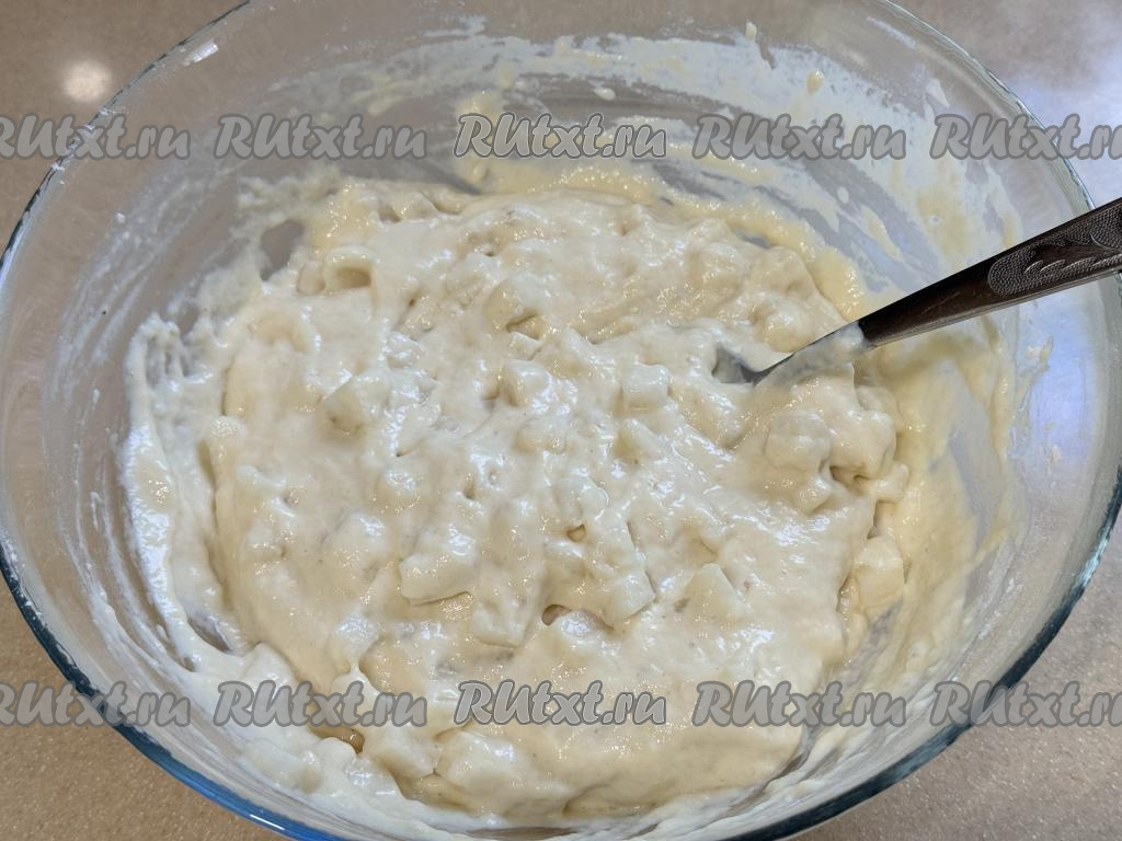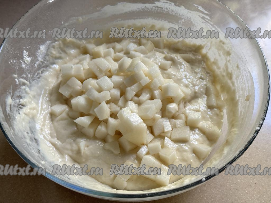 Грушу очистить от кожуры, удалить семенную коробку с семечками. Нарезать грушу на мелкие кубики, добавить в тесто, перемешать.