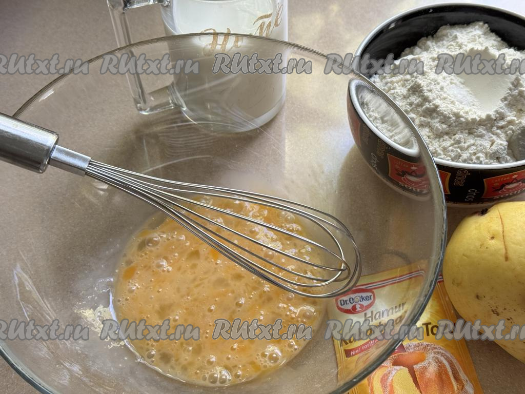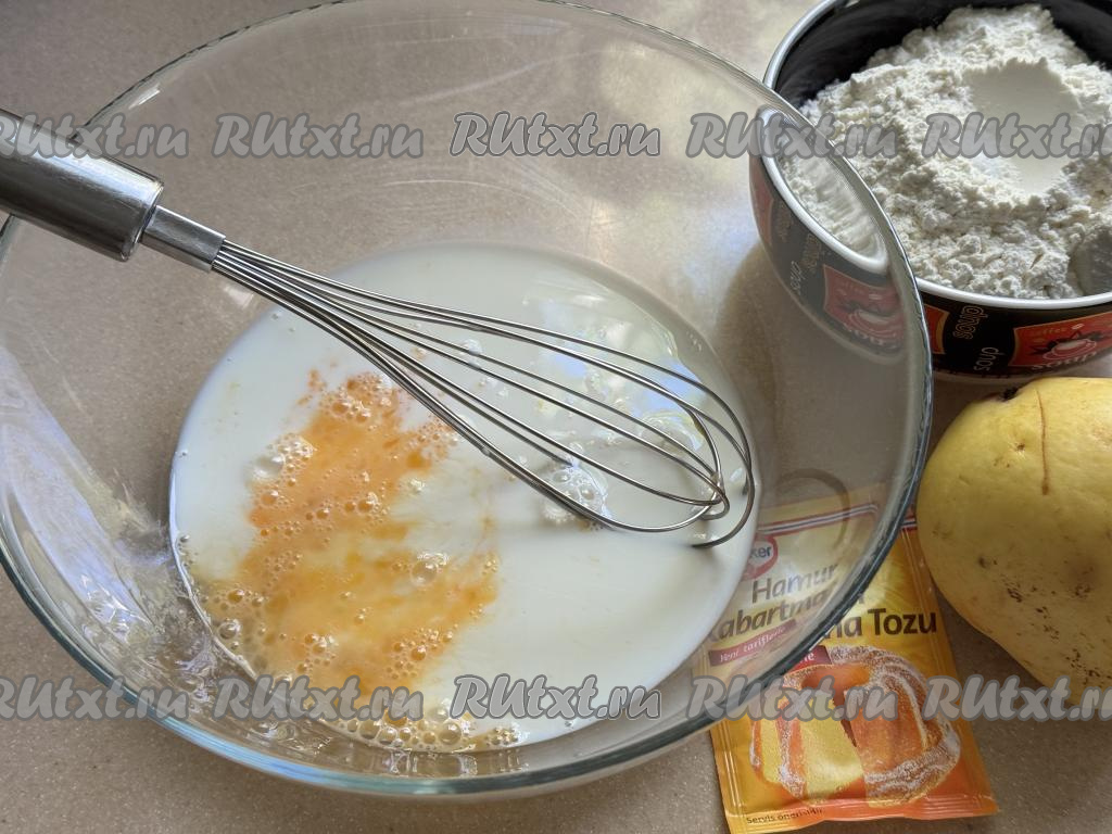 Влить молоко в миску с яичной массой, перемешать венчиком.