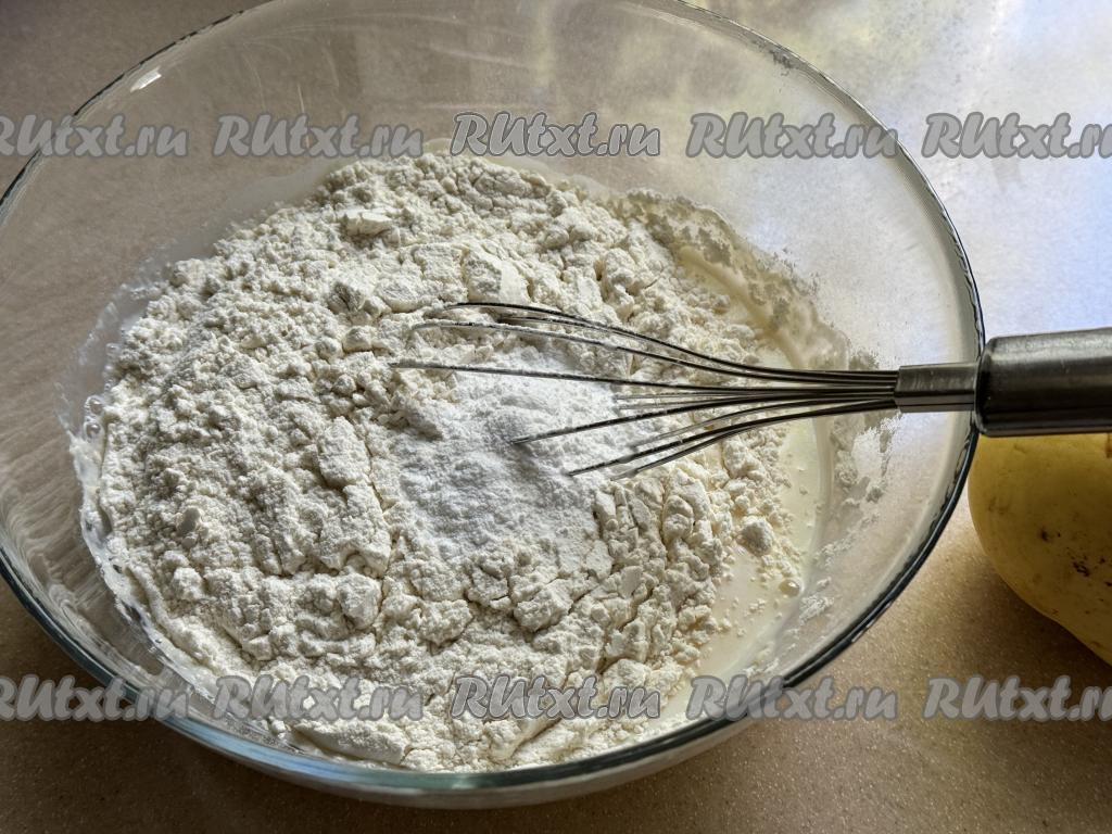 Добавить в миску 100 грамм муки и весь разрыхлитель, перемешать венчиком.