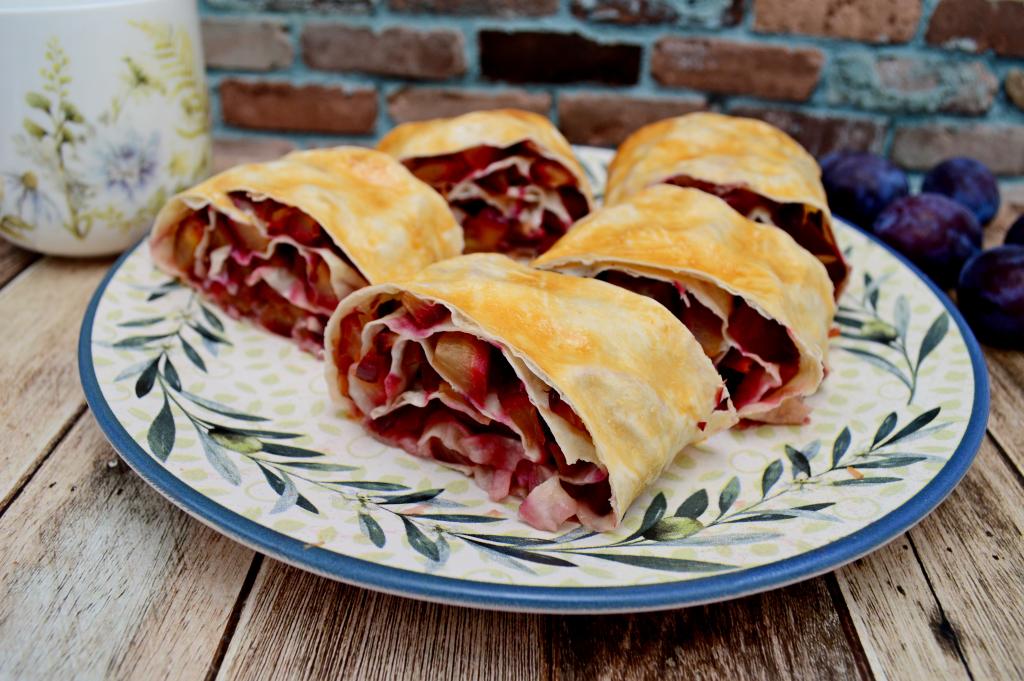 Готовый штрудель вынуть из духовки, остудить и можно нарезать на кусочки острым ножом. Любители слив в выпечке будут в восторге, большое количество сливовой начинки и тонкое тесто из лаваша делают этот рулет невероятно вкусным.
