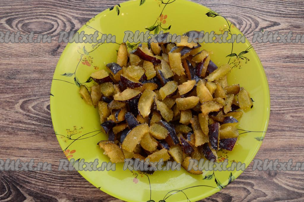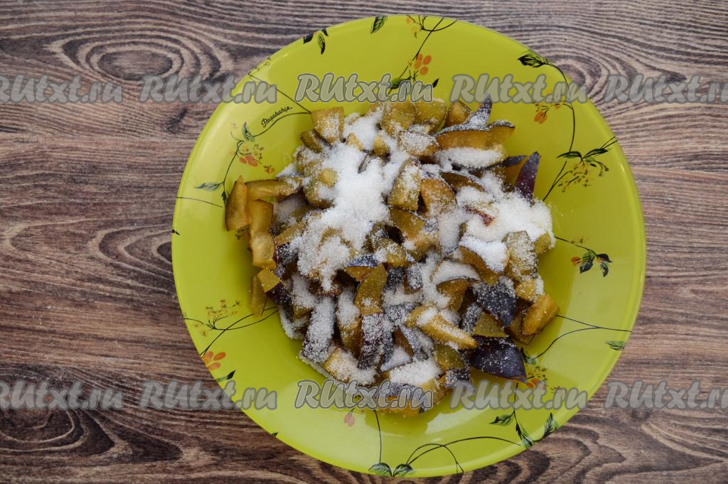 Нарезанные сливы выложить в глубокую тарелку, всыпать сахар.