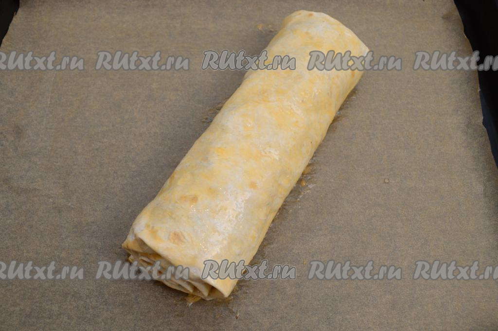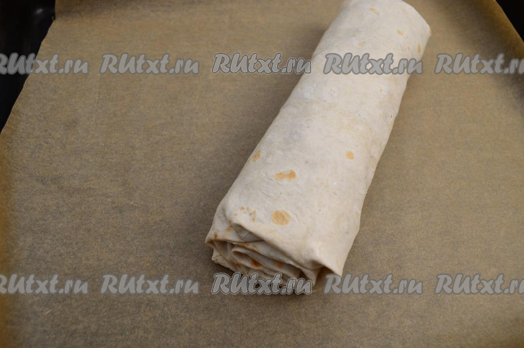 Переложить рулет из лаваша на противень, застеленный пергаментом.