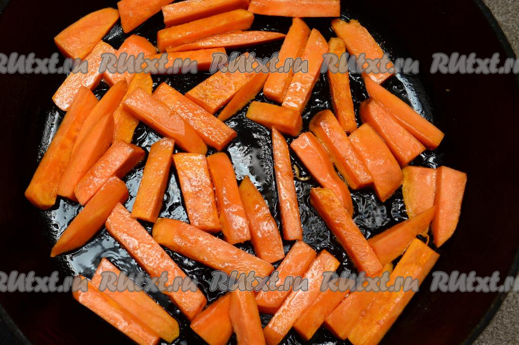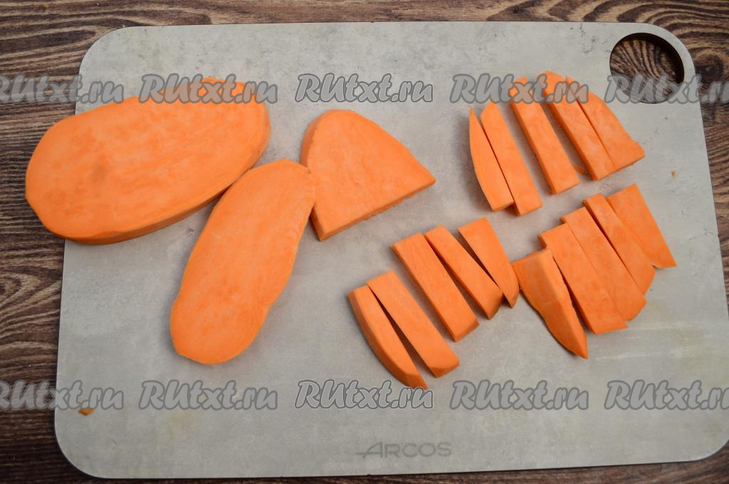 Нарезать батат на примерно одинаковые брусочки толщиной около 1 сантиметра.
