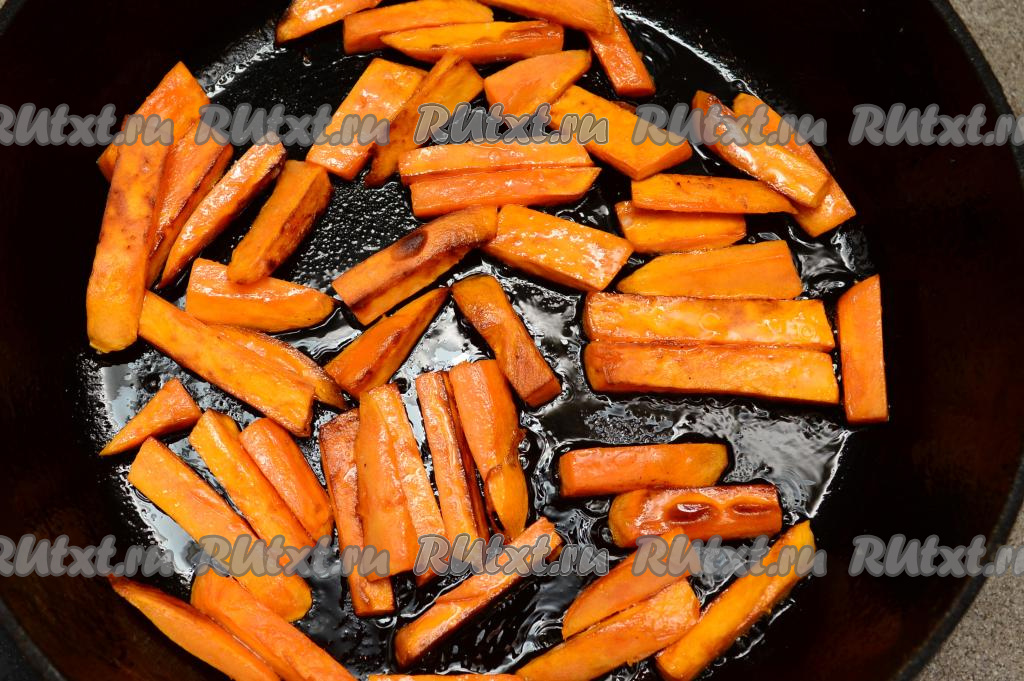 Сковороду хорошо разогреть с растительным маслом. Масла добавляйте достаточно много. Я на сковородку диаметром 28 сантиметров добавляю не менее 4 столовых ложек масла. Выложить брусочки батата на хорошо разогретую с маслом сковороду, желательно, в один слой.