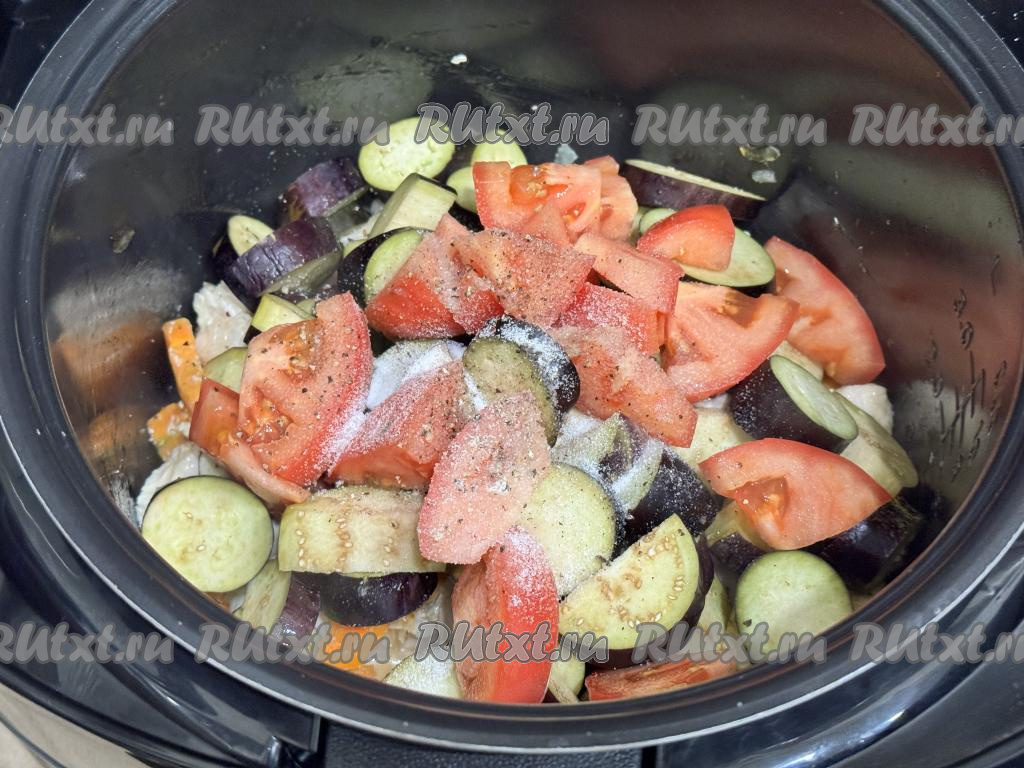 Перемешать мясо курицы с баклажанами, помидорами, морковкой и луком, закрыть крышку мультиварки, выставить режим "Тушение" на 30 минут. Воду я не добавляю, овощи с кусочками курицы томятся в собственном соку. Но в процессе тушения можно открыть крышку мультиварки и, если сока маловато, добавить совсем немного воды.
