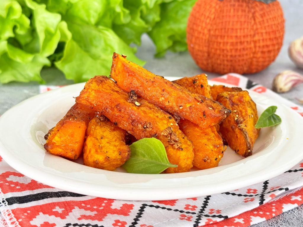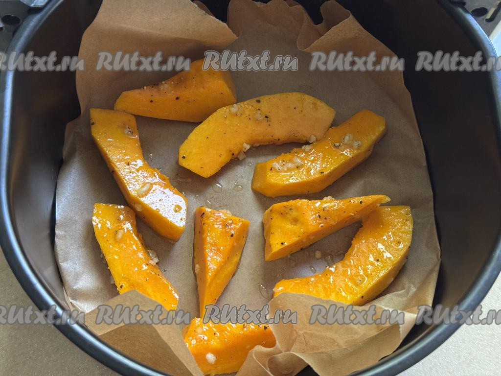 Запекать тыкву в аэрогриле при температуре 180 градусов в течение 25-30 минут (кусочки тыквы должны стать достаточно мягкими, легко прокалываться ножом). Если по истечении 25-30 минут тыква осталась твердоватой (многое зависит от сорта тыквы и толщины нарезки), тогда увеличьте время запекания на 5-10 минут.
