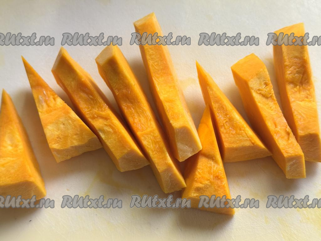 Нарезать тыкву на кусочки, я нарезала на средние брусочки примерно одинакового размера.